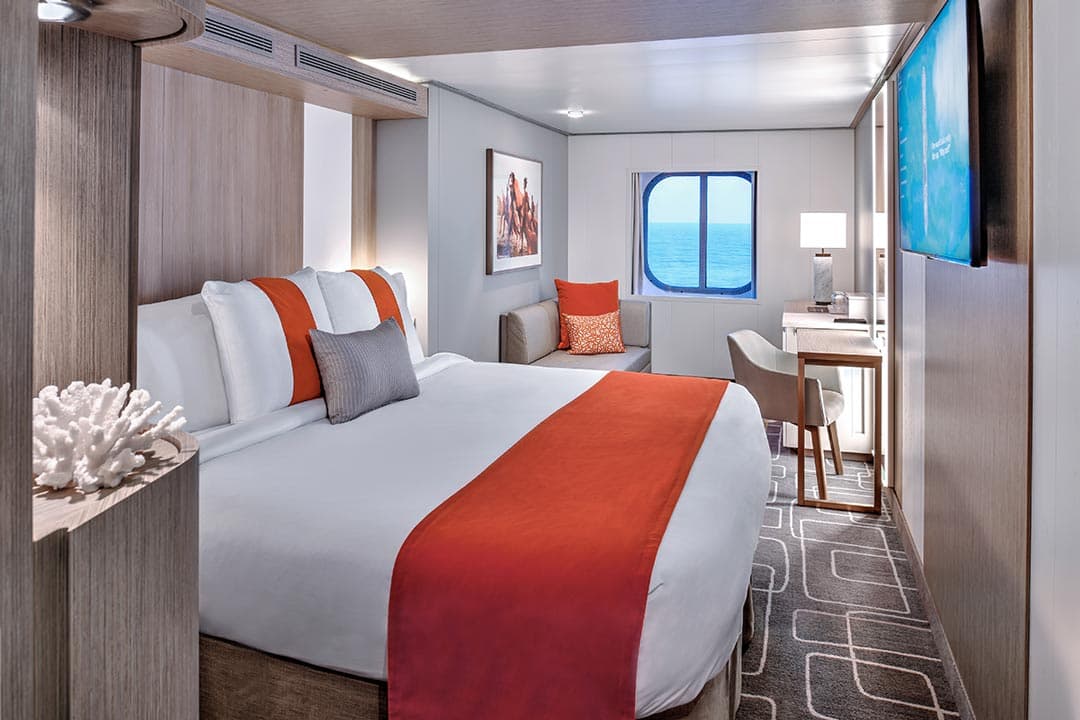 Take in the stunning views while you relax in your Ocean View Stateroom. Like all Edge Class Staterooms, this stateroom is furnished with pure comfort in mind. From spacious living areas to the comfortable king-size Cashmere Mattress featuring eXhale bedding.