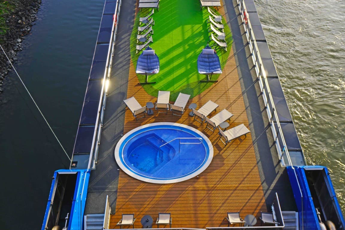 On board the MS VIVA ONE, guests have access to a restaurant, a fitness room and a sauna room with and Gym with state-of-the-art equipment. The MS VIVA ONE also has a lounge with bar and plenty of space for dancing, while a cozy bistro with terrace and coffee station is located at the rear of the ship. The ship also has an on-board boutique, water dispensers, a spacious sun deck with pool and sun loungers and a putting green. The ship is fully air-conditioned.